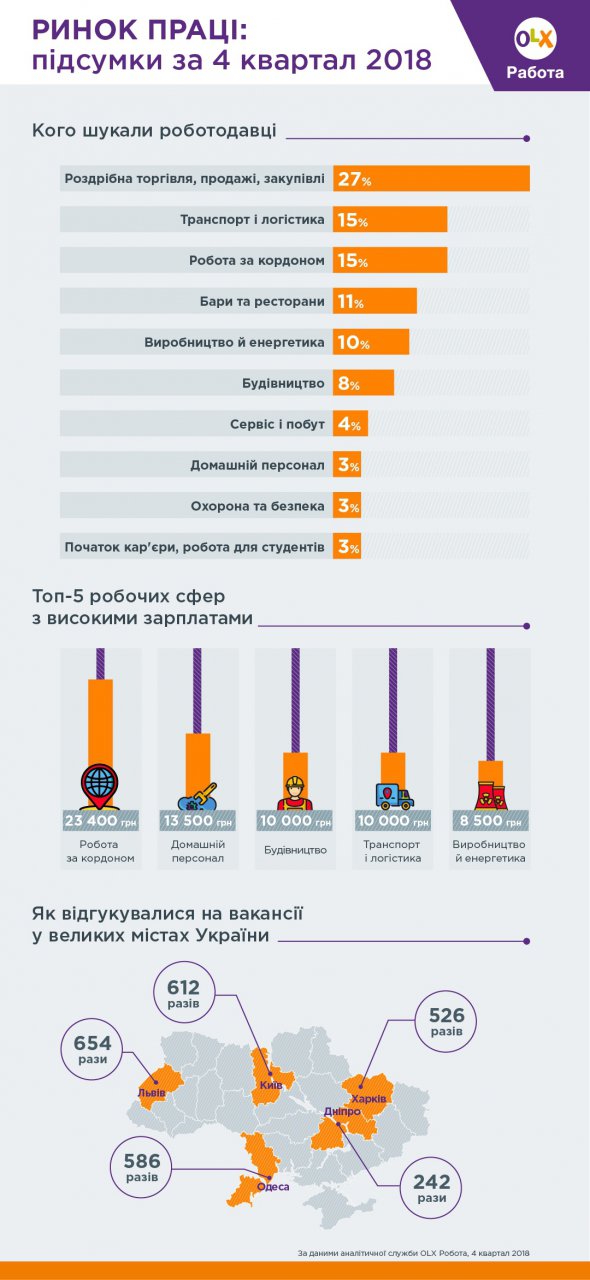 В Україні у VI кварталі 2018-го найбільш затребуваними наприкінці року були фахівці у сфері торгівлі та логістики. Попитом користувалася категорія “робота за кордоном”. Роботодавці шукали обслуговуючий персонал до барів і ресторнів. Пропонували роботу у сфері виробництва та енергетики. Водночас попит на будівельників і фахівців агросектору різко впав.